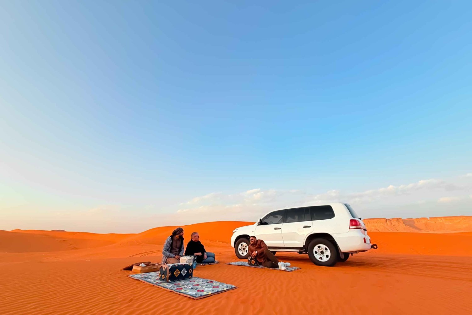 Tag væk fra byen, og dyk ned i Riyadhs ikoniske Red Sands for en eftermiddag med dune bashing, ATV-kørsel og sandboarding-aktiviteter. Slap derefter af i The Arabian Experience Desert Camp under en himmel med en million stjerner. Din eftermiddag begynder med afhentning i Riyadh (ruten kan passere Kingdom Tower og Al Faisaliah Tower), mens bybillederne bliver til rolige forstæder, traditionelle kamelfarme og sandets skiftende nuancer, fra lyse guld til levende rød, med akacier og ørkenbuske. På Red Sands kan du mærke spændingen på de bølgende klitter, og derefter tage videre til lejren: bløde tæpper, puder med sadu-print og lygteglød sætter tonen. Når solen smelter ind i horisonten, kan du dele historier, spille kort eller brætspil og holde øje med kameler – og hvis du er heldig, ørkenræve eller gazeller. Tilføj kamelridning, falkefotografering og bål, og tilpas derefter madoplevelsen fra lette snacks til en komplet arabisk grillfest eller et traditionelt trykkogt måltid tilberedt over åben ild (anbefales på det varmeste!). Dette er Keshta i sin essens, forankret i samvær, komfort og varm saudisk gæstfrihed.Includes