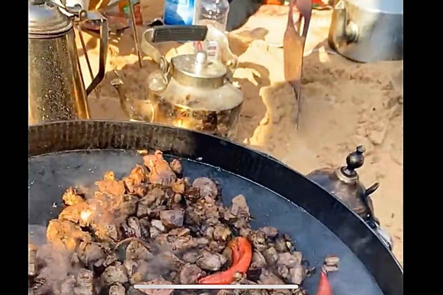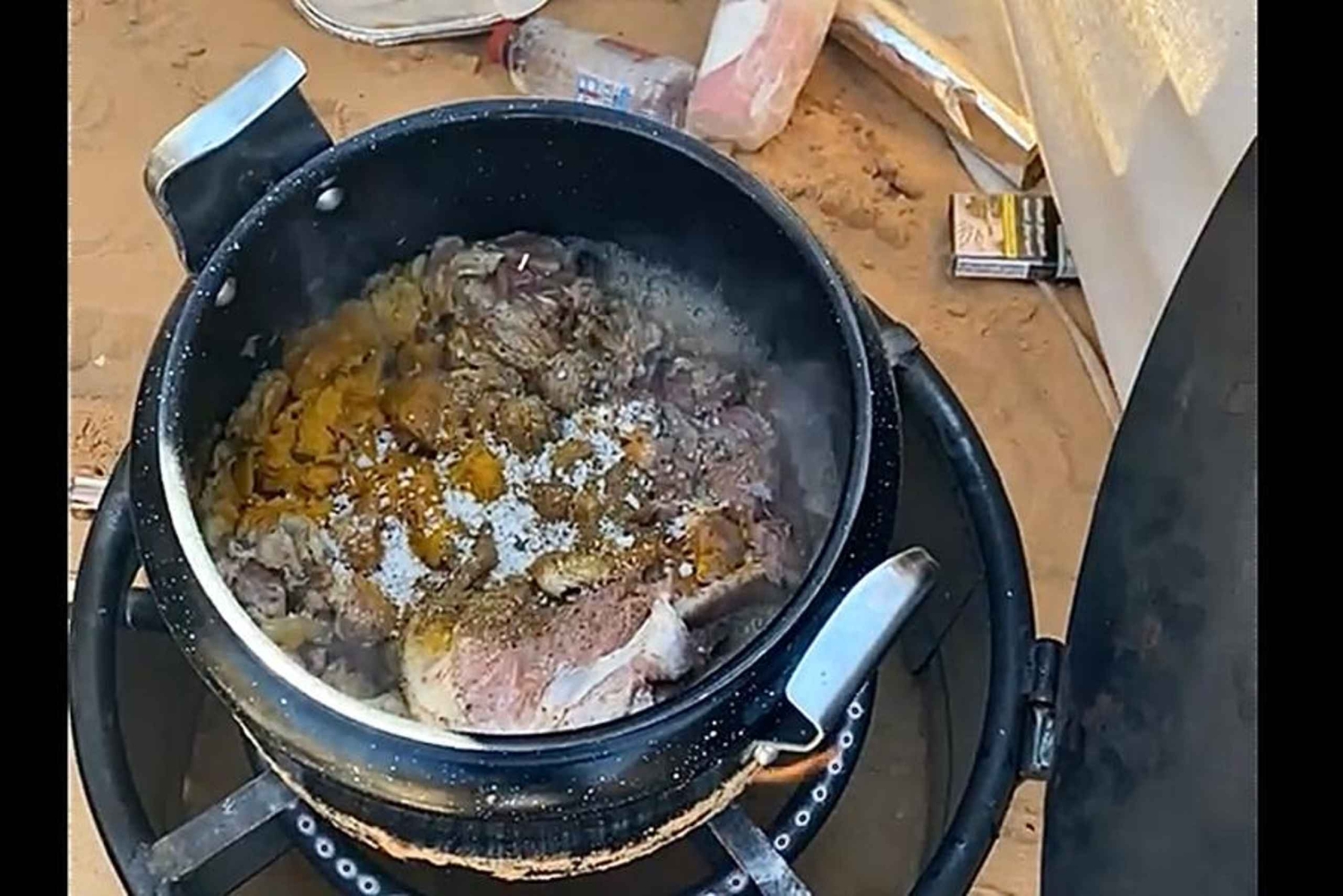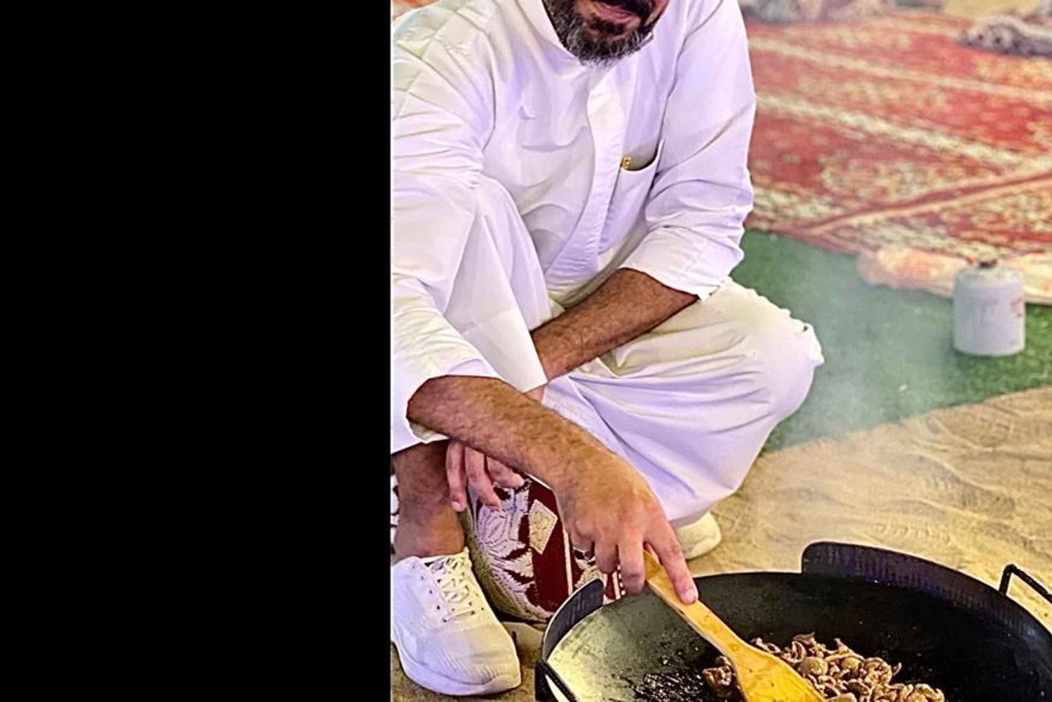 Lerne bei deiner Ankunft, wie man die köstliche saudische Kabsa zubereitet. Je nach Wahl wird die Kabsa mit Hühnchen, Kamelfleisch oder Lamm zubereitet. Du kannst auch Fleisch und Hühnchen in der Wüste grillen und den Abend in einer Atmosphäre voller Ruhe, Entspannung und Besinnung verbringen.