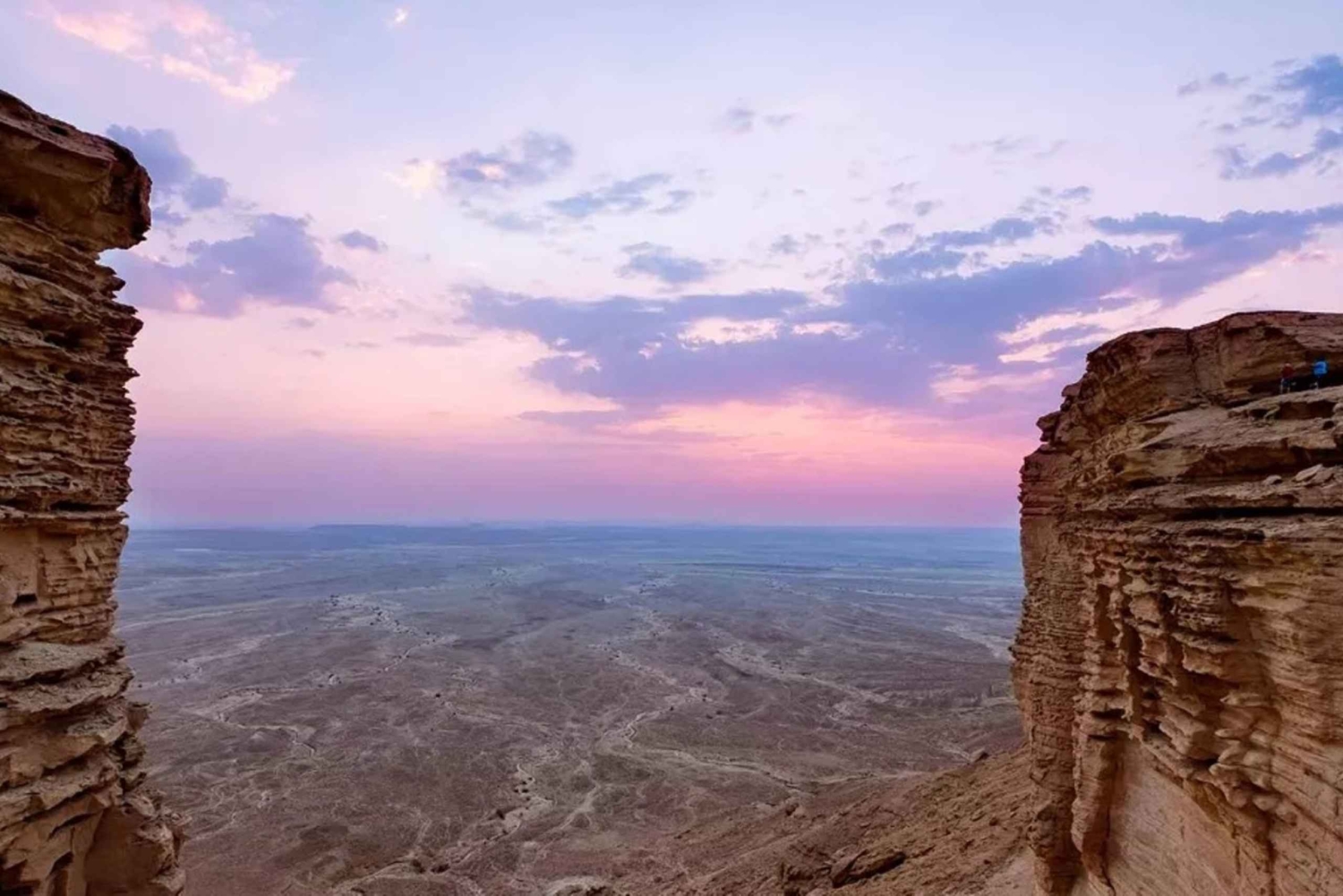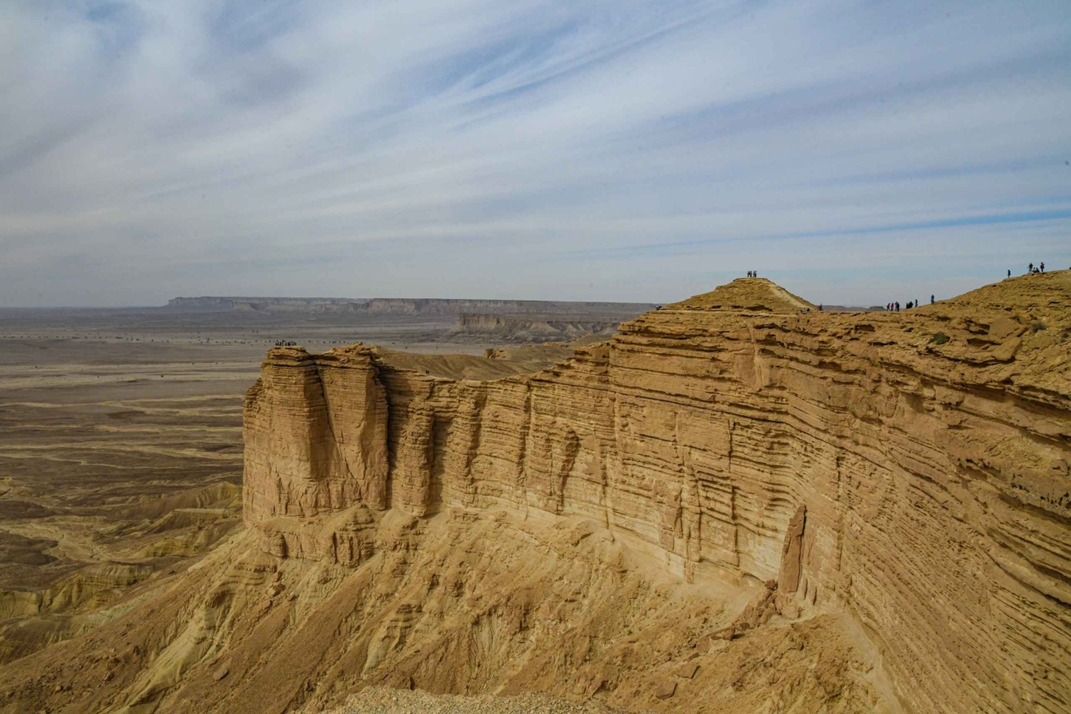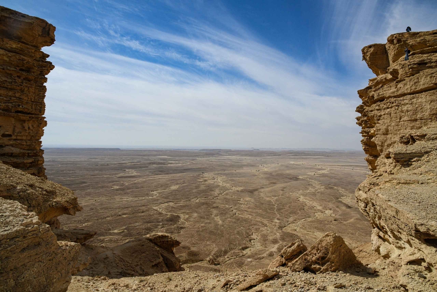 Auf dem Weg halten wir an der Fledermaushöhle und am Rande der Welt können wir entlang der majestätischen Klippen wandern und die atemberaubenden Aussichtspunkte genießen. Bei traditionellem Kaffee, Tee und einer leichten Mahlzeit gibt es eine Erklärung zur saudischen Kultur, während wir den malerischen Sonnenuntergang beobachten.>