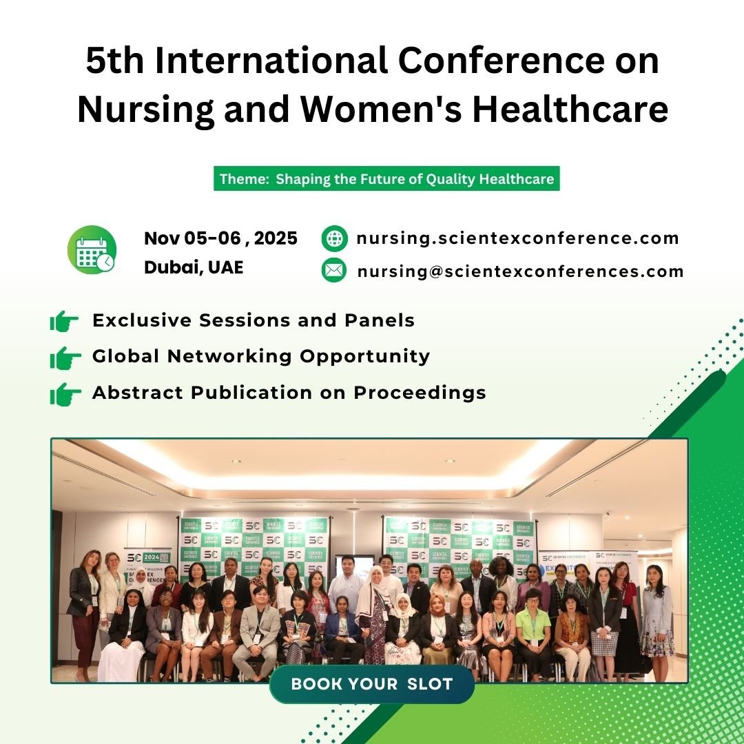 'En nombre del comité organizador, le invitamos cordialmente a la 5ª Conferencia Internacional sobre Enfermería y Salud de la Mujer que se llevará a cabo del 5 al 6 de noviembre de 2025 en Dubái, Emiratos Árabes Unidos. Este evento reúne a destacados expertos para debatir los avances en enfermería y salud de la mujer. ¿Por qué asistir? Ponencias magistrales: Oradores de renombre en temas de vanguardia. Networking: La plataforma global líder para impulsar el progreso en enfermería y salud de la mujer.'