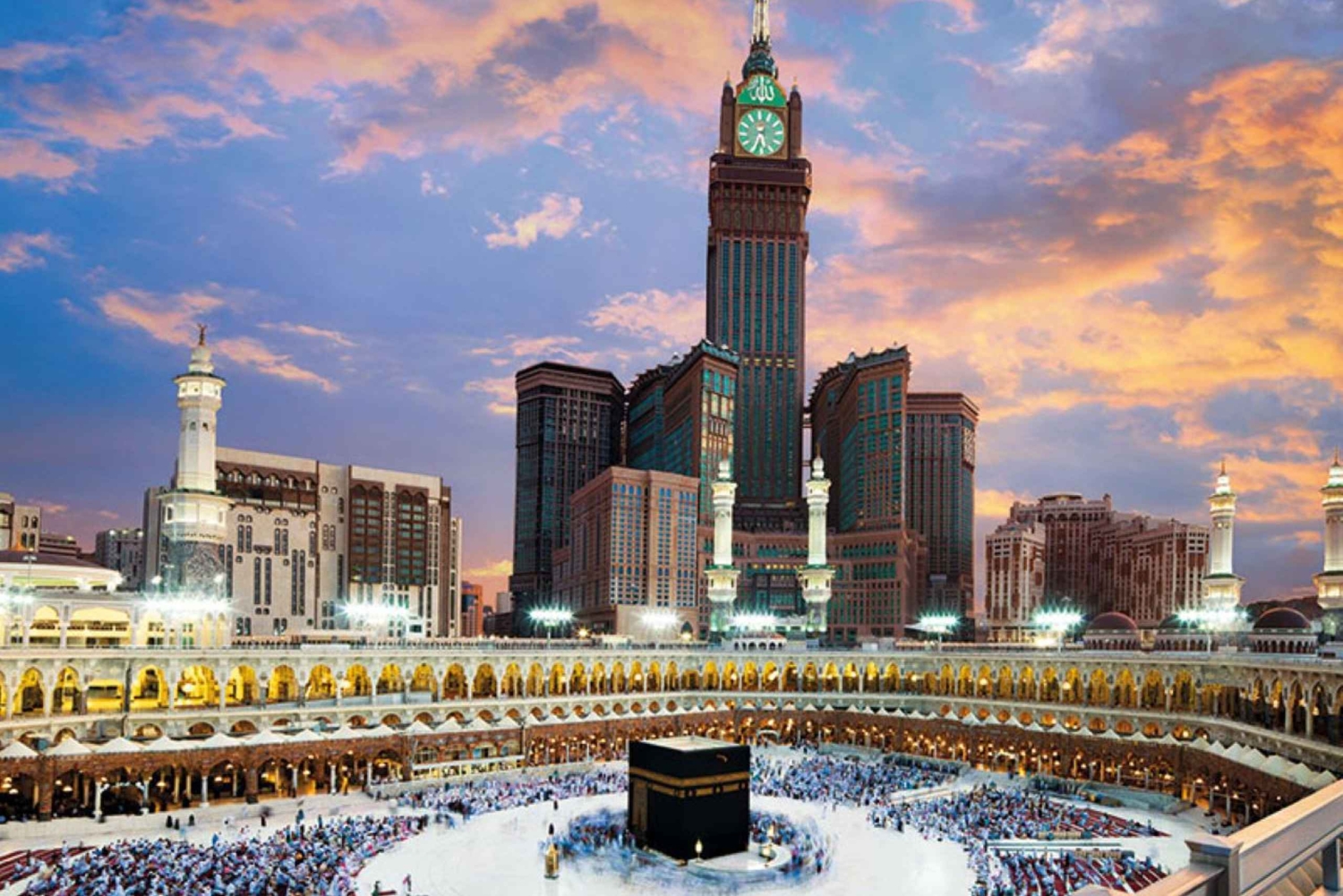 Dès votre départ, votre personnel accompagnant aura toute votre attention. Une fois dans la voiture, votre guide vous parlera de toutes les choses que vous verrez en chemin, ainsi que d'autres aspects de votre circuit qui vous intéresseront. Vous commencerez votre visite par le Masjid Taneem, une mosquée située dans la région d'Al-Hil, à environ huit kilomètres de la sainte Kaaba à Taneem, près de La Mecque. Il s'agit d'une mosquée assez grande qui dispose de salles de bain, d'ablutions et de vestiaires pour les pèlerins et les fidèles. Vous visiterez ensuite la Masjid al-Haram, point de convergence de tous les musulmans et plus grande mosquée du monde. Al Masjid Al Haram peut accueillir un million de fidèles et couvre une superficie de 356 800 mètres carrés. À son épicentre se trouve la sainte Kaaba, recouverte d'un tissu noir et or, autour de laquelle les musulmans effectuent une circumambulation jour et nuit (appelée tawaf). C'est l'édifice le plus sacré de l'islam et la pièce maîtresse des pèlerinages islamiques (Hajj et Umrah). Passez ensuite à votre prochaine visite : Exposition de l'architecture des deux saintes mosquées. Elle présente des collections rares des deux saintes mosquées et l'évolution de leur architecture au cours de l'histoire, ainsi que les réalisations de leur développement et les services qui leur sont fournis depuis l'époque du défunt roi Abdulaziz Al Saud jusqu'à l'époque du Gardien des deux saintes mosquées, le roi Salman bin Abdulaziz Al Saud. Enfin, retournez confortablement à votre hôtel.Includes