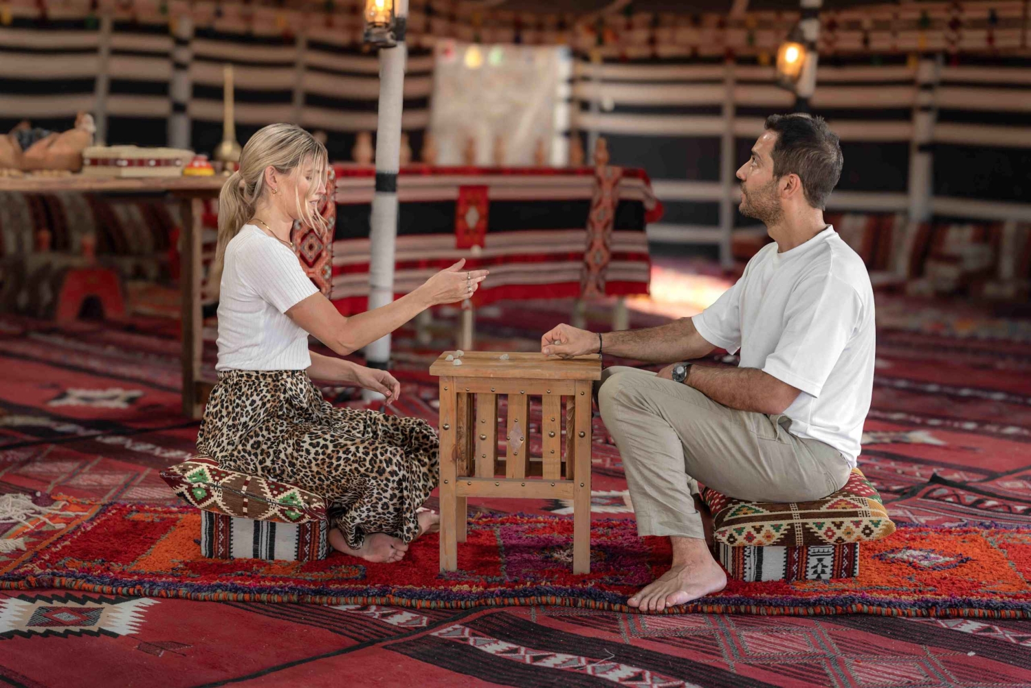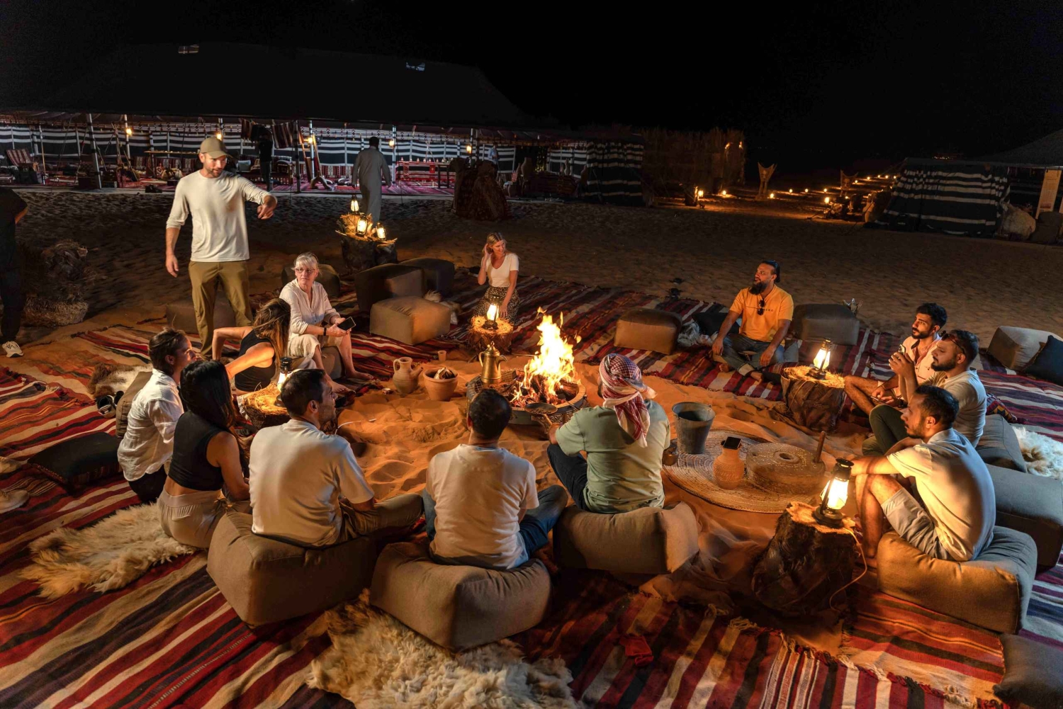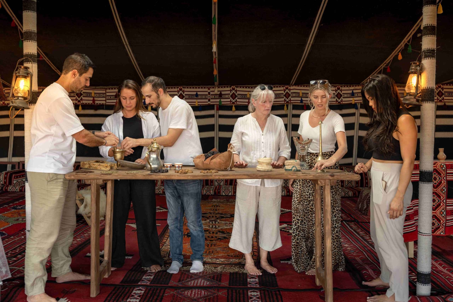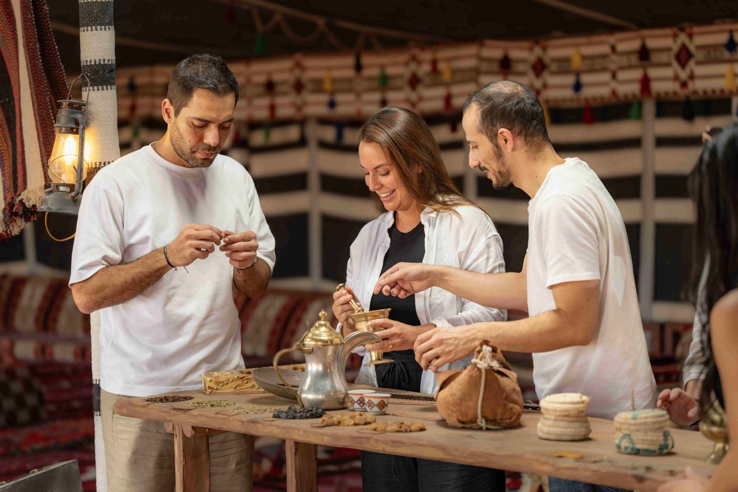 Cena a base di pollo mandi, cotto in forni sotterranei Giro in cammello Sandboarding Guida che parla inglese e arabo Tenda interattiva Abiti tradizionali Gioco degli aromi delle spezie Tavoli di scoperta dei manufatti beduini Trasporto Giochi da tavolo Caffè, tè, acqua e pane beduino cotto sul fuocoImportant Information