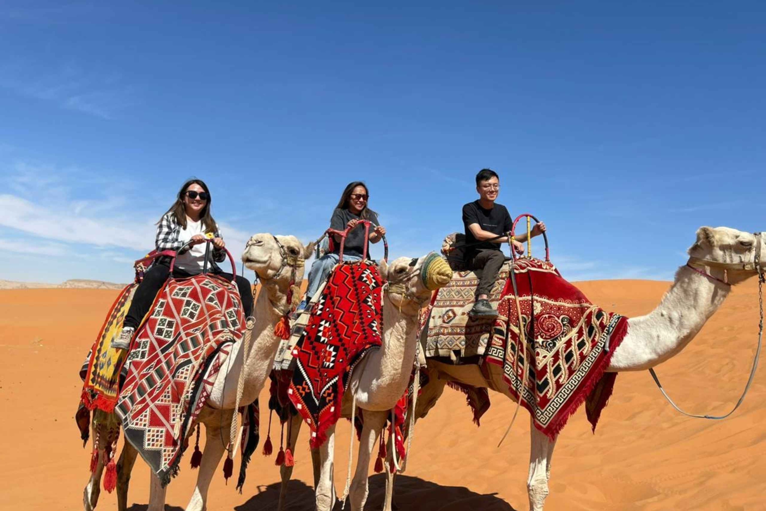 Scappa dalla città e scopri la magia delle dune di sabbia rossa di Riyadh, uno dei paesaggi desertici più mozzafiato dell'Arabia Saudita. Unisciti alle nostre guide locali professionali per un'avventura indimenticabile nel deserto, all'insegna del divertimento, dell'emozione e di paesaggi mozzafiato. Fai un giro in cammello tra le dune dorate come un vero beduino. Guida il tuo quad (All-terrain vehicle) e prova il brivido di sfrecciare sulle colline di sabbia rossa. Prova il sandboarding sulle dune morbide e scatta foto epiche. Rilassati e ammira il tramonto, gustando caffè arabo, datteri e spuntini leggeri mentre il cielo diventa dorato. Il nostro tour include trasferimenti di andata e ritorno da Riyadh in comodi veicoli 4x4, acqua in bottiglia e un cordiale team locale per rendere il tuo viaggio sicuro e indimenticabile. Perfetto per: amici, famiglie, amanti dell'avventura e visitatori per la prima volta che vogliono vivere il vero spirito del deserto dell'Arabia Saudita.Includes