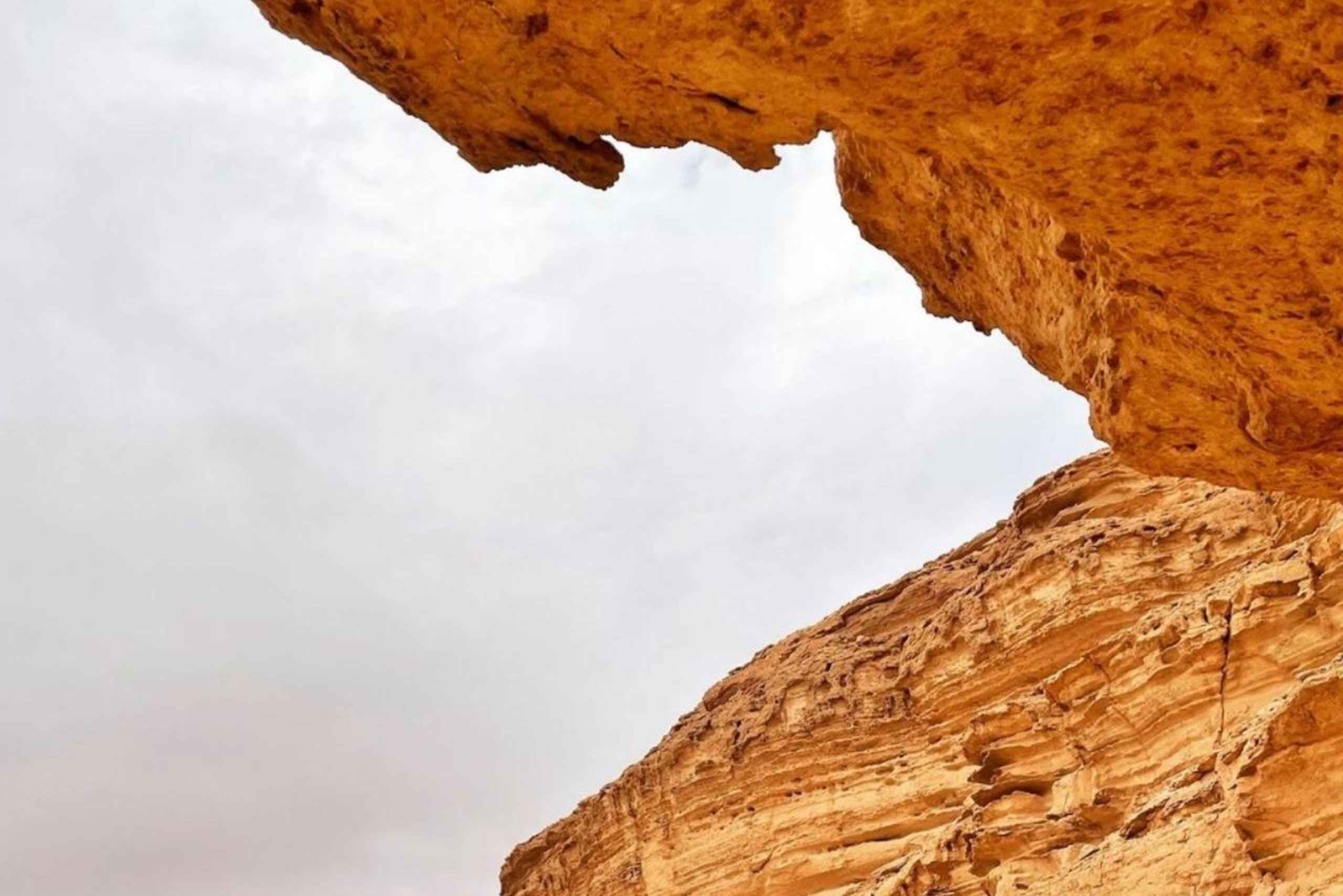 Like utenfor den travle byen Riyadh ligger et av Saudi-Arabias mest imponerende naturlige underverk – Verdens ende (Jebel Fihrayn). Når solen begynner å gå ned, søles det gyldne lys over de enorme ørkenslettene, og plutselig forstår du hvorfor reisende fra hele verden kommer hit: Det føles virkelig som å stå på kanten av uendeligheten. Eventyret begynner når guiden ønsker deg velkommen og leder deg på en reise utenfor byens grenser. Du går om bord i et komfortabelt kjøretøy med firehjulstrekk, og etterlater den urbane skyline mens ørkenhorisonten åpner seg. Selve turen er en del av spenningen – vi slynger oss over sandbaner og eldgammelt terreng som en gang var dekket av tropiske hav for 150 millioner år siden. Når du kommer til de tårnhøye klippene, kommer utsikten til å ta pusten fra deg. Fra dette utsiktspunktet kan du se gamle tørkede elveleier, fossilisert sjøliv innebygd i fjellet, og kanskje til og med en kamelkaravane som beveger seg langt under – en påminnelse om de gamle handelsrutene som en gang krysset disse landene. Når solen går ned og kaster flammende fargetoner over Tuwaiq-skråningen, inviterer guiden deg til å slappe av og nyte en autentisk arabisk kveld. Nipp til nybrygget arabisk kaffe og te, smak på lokale snacks og nyt ørkenens rolige stillhet. Når det er på tide å dra tilbake, tar du med deg mer enn bare bilder – du tar med deg en følelse av undring som ord knapt kan beskrive.Includes